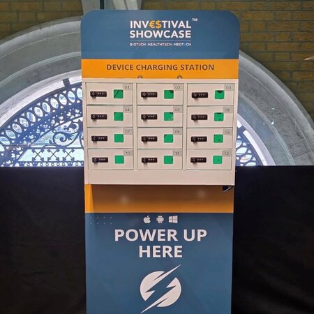 Twelve Bay Charging LockersThe Chill & Charge Twelve Bay Locker provides a secure charging locker for up to 12 devices at a great price. Each locker is secured with a 3 digit code. Custom branding is available on the floor-stand. Specifications:- 12x Multiway Apple Lightning / USB-C/ Micro USB